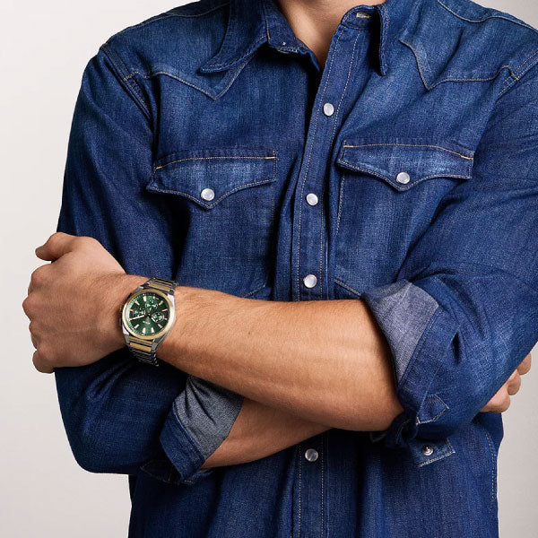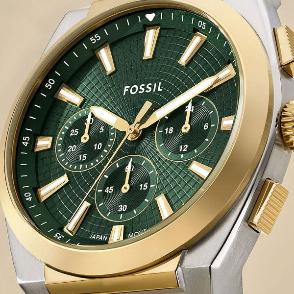 Exuding effortless style, the Fossil Everett Chronograph watch. This sporty watch balances casual cool with refined sophistication. The sunray green dial, encased in a round two-tone stainless steel case, lends a touch of modern inspiration. Functional details like Japanese chronograph quartz movement and a date window ensure this versatile timepiece keeps you on schedule. Slip on this iconic accessory and take on whatever comes your way.
