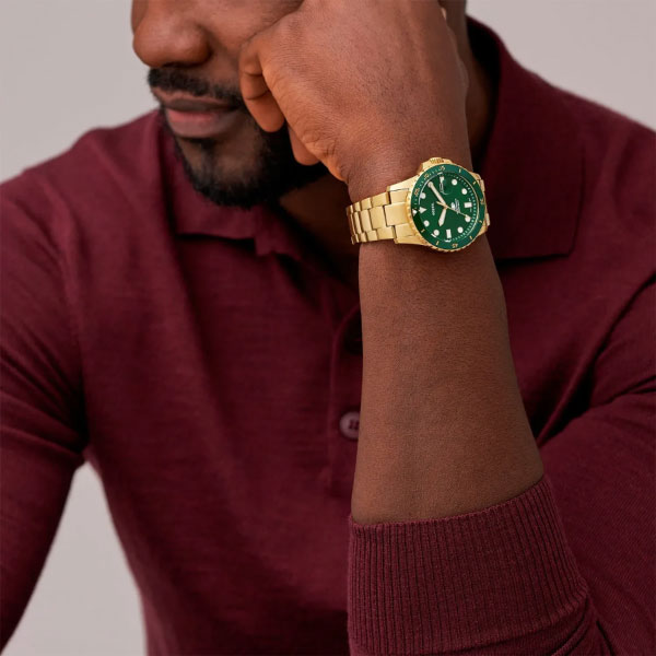 The Fossil Dive watch stands out with its bold design and functional features. Featuring a 42 mm diameter, this watch makes a powerful statement on the wrist. Its round case is surrounded by a glossy bezel, which frames a striking green dial marked by clear indices and a distinctive date window. The watch hands are prominent, ensuring easy readability against the green backdrop. The case and strap are gold-toned, adding a touch of elegance to its robust appearance.