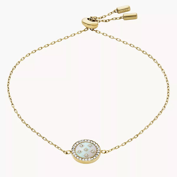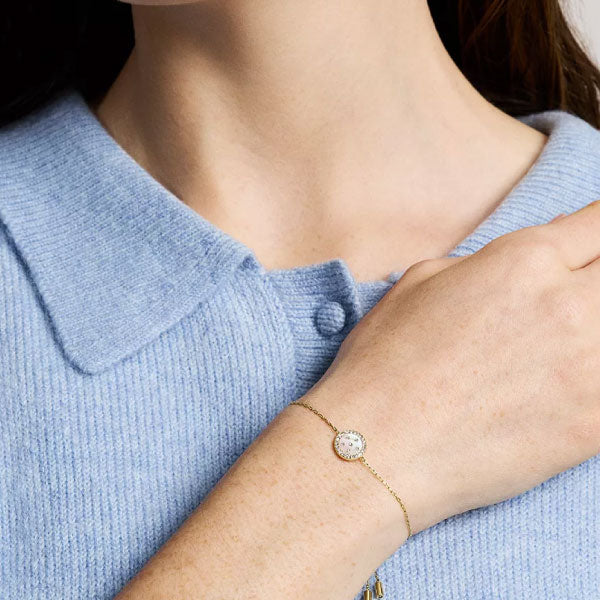 Refined and radiant, the Classic Mother-of-Pearl collection lends effortless elegance. The gold-tone stainless steel station bracelet features a lustrous mother-of-pearl station punctuated by sparkling crystals. Sliding adjustability ensures the perfect fit. Elevate any look with this timeless piece.