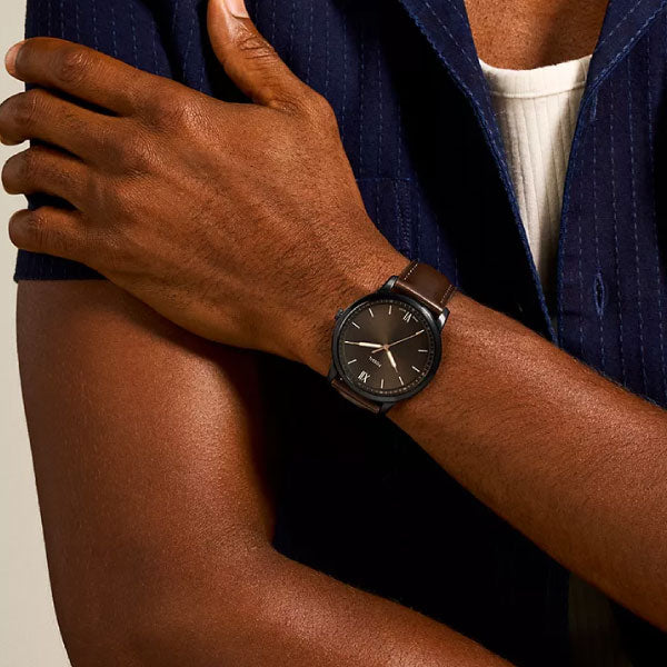 The Fossil Minimalist features a black sunray dial with Roman numeral and stick indices, three-hand movement and a brown leather strap.