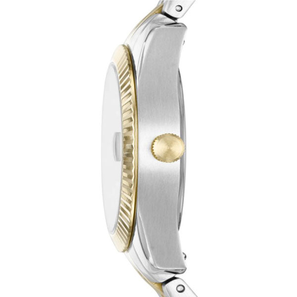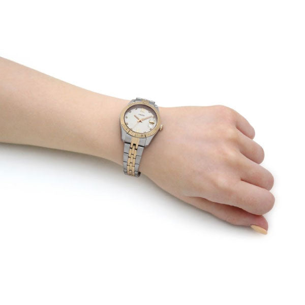 This Fossil Scarlette Mini watch features a gold sunray dial, three-hand date movement and a two-tone silver and gold stainless steel bracelet.