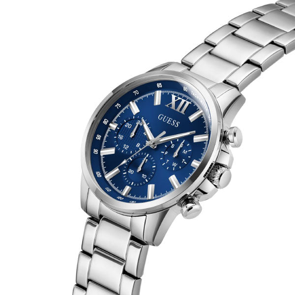 Sure to be a staple in your watch wardrobe this clean dress look features a chrono-look multi-function blue dial and is paired with a sleek metal bracelet.