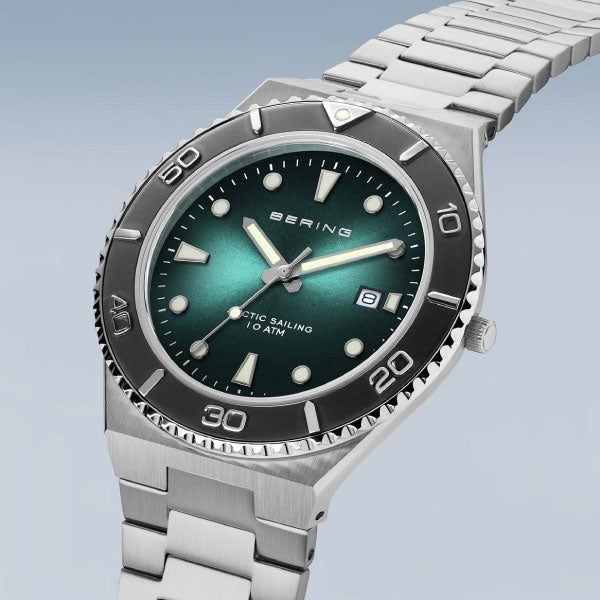 Sporty, striking, functional: This watch is from the Arctic Sailing collection. A super-flat case and a wide link bracelet made of robust, brushed stainless steel, the bezel and illuminated hands and indices give this watch a powerful, sporty look. A noble detail is the Sunray dial with date display, which shimmers in the daylight like the sun on Arctic ice. Scratch-resistant sapphire glass and an IP coating make the model extremely resistant. It is water-resistant and functions reliably up to a pressure of 10 ATM. An ideal companion at sea as well as on land.