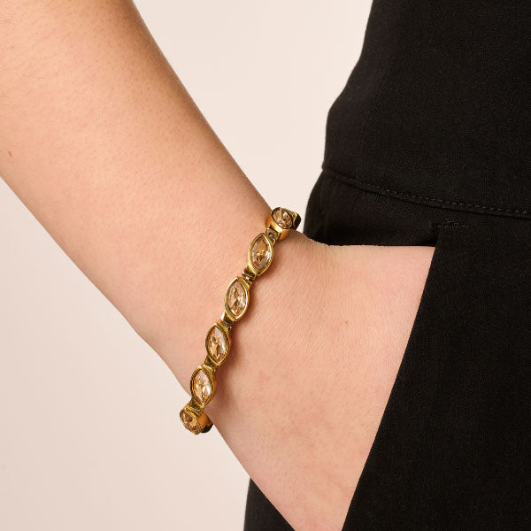 Celtis - is an elegant and narrow tennis bracelet designed in polished steel mounted with a line of navette shaped crystals. The distinct bracelet with the unusual crystal stones is designed in polished steel, overlaid with a technical coating that just lasts. Here shown in gold tone and golden crystals.