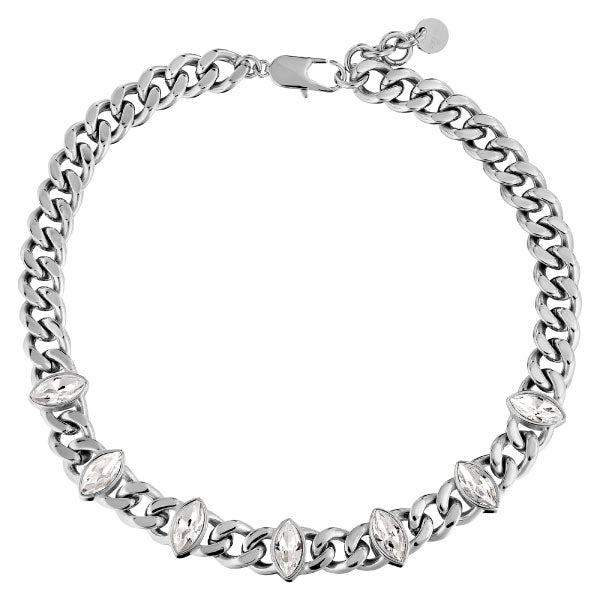 Punica is a chunky short necklace that lies beautifully in the neckline with its 42 cm length + 5 cm extension chain. Super rock`n`roll, attention-grabbing and at the same time wearably modern. The chain jewel is designed in polished steel, and the seven navette-shaped crystals stun and surprise. Wear Punica with a simple top or evening dress as you please. Shown here in silver tone version with stones in classic white crystal.