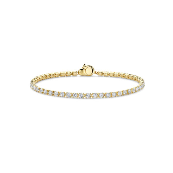 Indulge in refined brilliance with this Ti Sento gold-plated silver bracelet. Crafted from 925 sterling silver and plated with radiant yellow gold, this tennis bracelet features a continuous row of hand-set white cubic zirconia stones in round prong settings, each catching the light with exceptional clarity and fire. The warm golden tones contrast beautifully with the icy sparkle of the stones, offering a sophisticated take on a classic silhouette. Its sleek clasp blends seamlessly into the design, ensuring security without interrupting the fluid line of shimmer. Whether worn alone as an elegant showpiece or layered for modern glamour, this bracelet elevates every moment, from everyday elegance to celebratory occasions. A timeless essential in any fine jewellery collection. Nickel-free and hypoallergenic for all-day comfort.