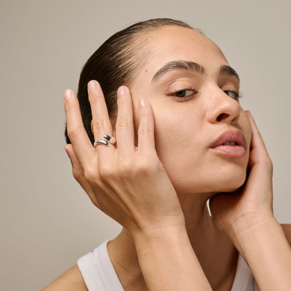 The Neli Ring is designed with inspiration from the soft movements of nature. It has an elegant, open silhouette with voluminous shapes that wrap around the finger. The shiny silver surface provides an exclusive and modern expression, while the adjustable size ensures it fits perfectly for you – no matter the occasion.