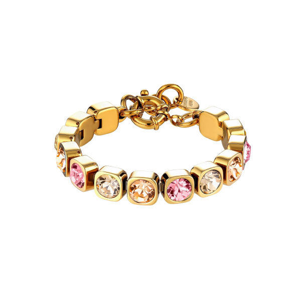A firm favourite chunky stainless steel linked bracelet, handset with multiple facetted sparkling crystals. Length 17cm + extension, here shown in gold tone and a mix of peach, rose and golden stones. Handmade. Nickel free and Danish design.