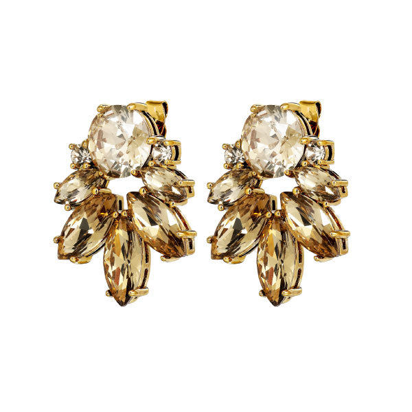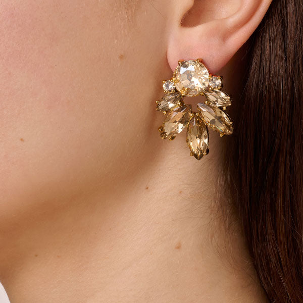 Drago is an eye-catching and elegant earring combined by a semicircle of leaf-shaped crystals, gathered around a larger round contrasting coloured stone – here shown in beautiful golden shades on a gold-toned finish. A surgical steel stud secures fastening. Wear Drago to a party – or simply whenever you want to stand out and look stunning.
