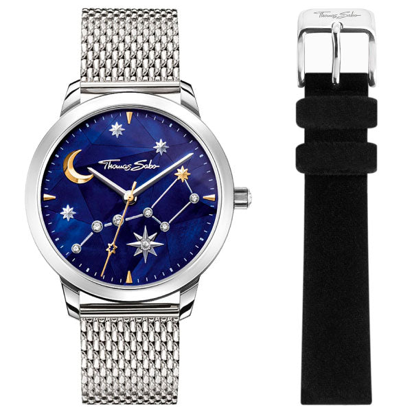 Time travel through the universe: The dial, richly decorated with star details, interprets the poetic beauty of the cosmos and is the highlight of this Spirit women’s watch from THOMAS SABO. The base is formed by genuine mother-of-pearl discs, which are assembled by hand in mosaic style and dyed blue to create a magically shimmering background. The dial is decorated with filigree stars, a moon and the constellation of The Plough - a striking constellation of stars in the northern hemisphere that is part of the Great Bear constellation. The different sizes of the round, facetted zirconia stones even imitate in detail the real proportions of the stars and symbolically provide orientation and luck.