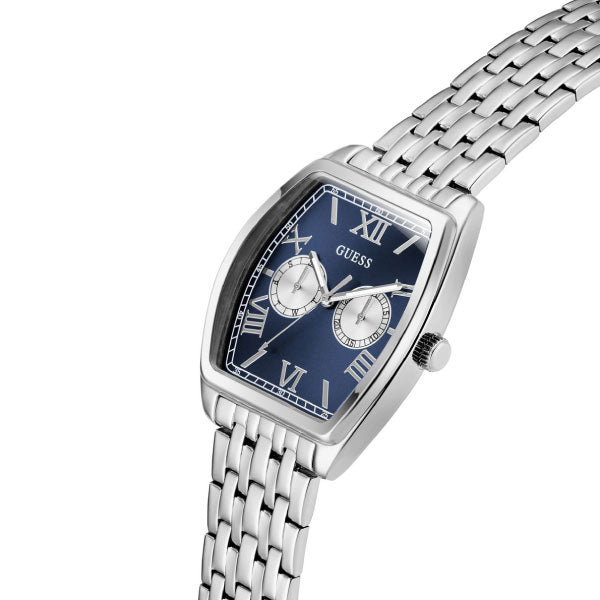 A refined rectangular profile gives Gabriel its dress‑watch edge. Silver‑tone finishing and a blue sunray dial keep it crisp, while multifunction sub‑dials add practical day/date. Designed to slide under a cuff with ease, it’s the smart choice when you want polish without fuss.