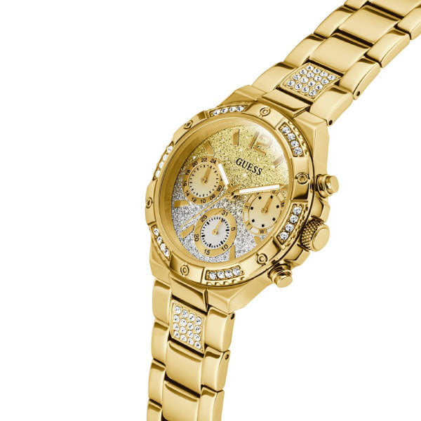 Turn up the glow with Harlow in gold. The ombré glitter dial pairs with warm gold‑tone plating for a head‑turning finish, while multifunction sub‑dials deliver practical day/date detail. Comfortable on the wrist and easy to style, it’s your go‑to when you want sparkle that still feels wearable.
