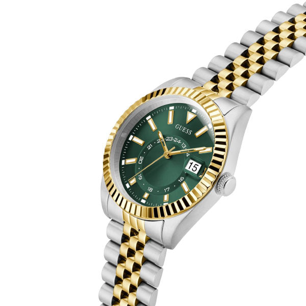 Two‑tone steel meets modern green. Jaden’s 42 mm case and bracelet mix silver and gold finishes for versatile styling, while multifunction sub‑dials add day/date practicality. Sharp, contemporary and easy to wear, it bridges casual and dress with ease.