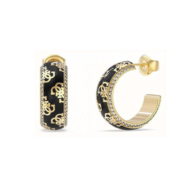 Add Guess Ladies Black 4G Logo Gold Plated Hoop Earrings to the cart