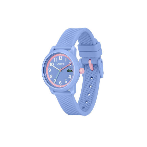 This model has a light blue strap, case and dial with a touch of pink, finished with the Lacoste branding.