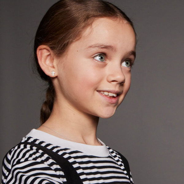 The Eden classic cross stud earrings in sterling silver. These sterling silver cross earrings are a timeless classic making them a cherished piece for jewellery lovers of all ages. The butterfly backs ensure that the earrings remain securely in place, offering comfort for prolonged wear, a classic first pair of kids earrings.