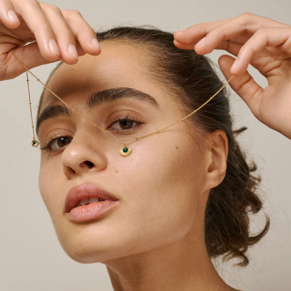 The unique gold Soleil Necklace in a deep Petrol Green color. The deep green hue creates an aura of elegance and mystery. The Petrol Green color adds a sophisticated and bold dimension to your style, standing out. Whether you want to add a bold color to your look or make a statement, the beautiful Petrol Green Soleil Necklace will certainly impress.