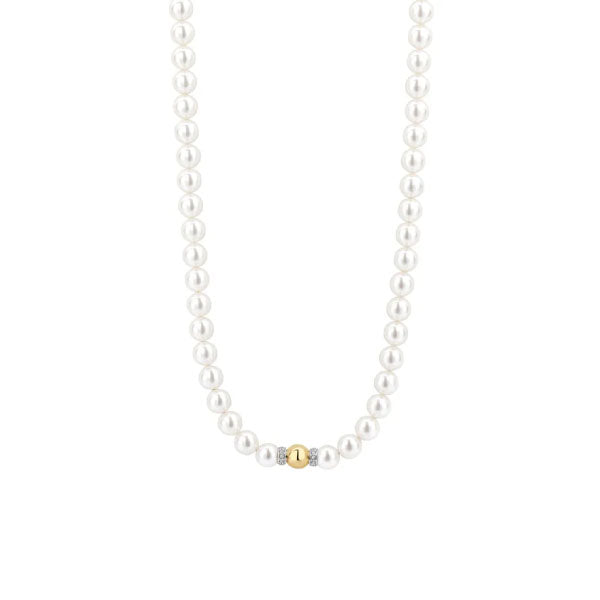 Celebrate timeless beauty with this Ti Sento gold-plated pearl Necklace 34112YP. A strand of radiant white pearls is elegantly punctuated by a polished yellow gold-plated sphere, flanked by pavé-set cubic zirconia accents that shimmer delicately with each movement. The harmonious balance of light, form, and texture elevates the classic pearl necklace into a refined contemporary statement. Crafted from premium 925 sterling silver and enriched with gold plating, this piece blends the softness of pearls with the opulence of golden accents. Its central focal point draws the eye and adds a modern signature to this heritage silhouette. Wear it with a silk blouse or evening dress for a look that whispers elegance, or layer it with dainty chains for a fresh take on pearl styling. Nickel-free and hypoallergenic, this necklace ensures enduring comfort alongside enduring style.