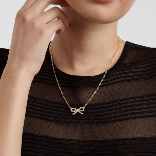 Complete your look with Ted Baker's Ribah Crystal Ribbon Bow Pendant Necklace. Featuring a delicate bow pendant adorned with fine European crystals, this necklace can elevate any outfit. Finished in gold-tone plating and equipped with an adjustable clasp for the perfect fit.