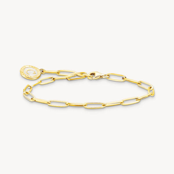 This charm bracelet is made of high-quality 925 sterling silver, refined with 18k yellow-gold plating, and its end is adorned with a round THOMAS SABO Charm Club Coin. The latter is decorated with white, shimmery cold enamel. You can complement the links inspired by long anchor chains with our charms as you wish, and create new combinations time and again. This golden bracelet is perfect for personal use or as a gift for your loved ones. The charm bracelet is available in lengths of 15, 17 and 19 cm.
