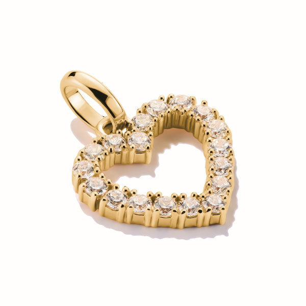 This heart charm crafted from 925 sterling silver with elegant 18k gold plating stirs romantic feelings. The open, minimalist design is encircled by sparkling white zirconia stones set in classic claw settings. These accentuate the heart’s symbolism and make the charm a wonderful gift for someone special. Thanks to its delicate loop, the gold-coloured charm can be worn on a bracelet or necklace and combined with other charms – perfect for expressing big emotions.