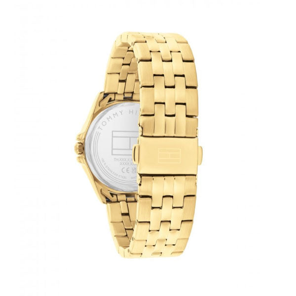 This simply designed watch is a versatile, easy-to-wear and timeless style. It features a 30mm gold plated stainless steel case. The sea green dial has applied stick indexes and the iconic Tommy logo at the 12 o'clock position. Completed with a gold plated stainless steel integrated link bracelet.