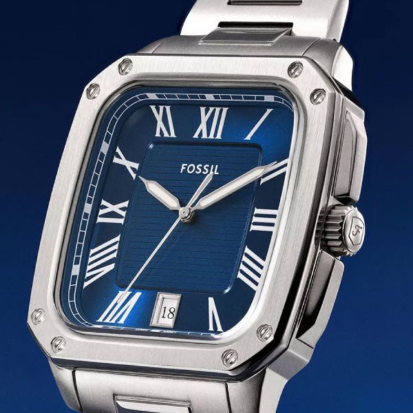 A modern classic with timeless appeal, the Crosby watch balances form and function. Its rectangular stainless steel case houses a blue-textured dial with a date window to keep you on schedule. The solid steel bracelet adds reliability and durability. Versatile yet distinctive, this classic timepiece belongs in your watch rotation.