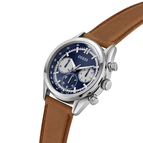 Make a bold statement with this men's GUESS Dawson chronograph watch, designed for the modern man who values both style and function. The striking blue dial is complemented by three multifunction silver tone sub-dials and a tachymeter scale, offering precision and sporty appeal. Crafted with a 44mm polished stainless-steel case and brown leather strap, this timepiece delivers durability with a sleek, sophisticated finish.