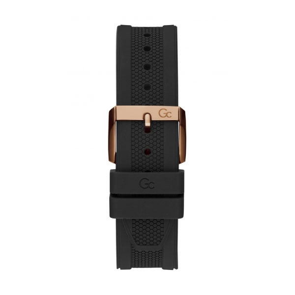 Impose yourself with this oversize modern take on the most iconic Gc chronograph, its brushed and polished rose gold tone case equipped with a black etched bezel, genuine carbon fibre dial with tachymeter and three sub-counters and black silicone strap.