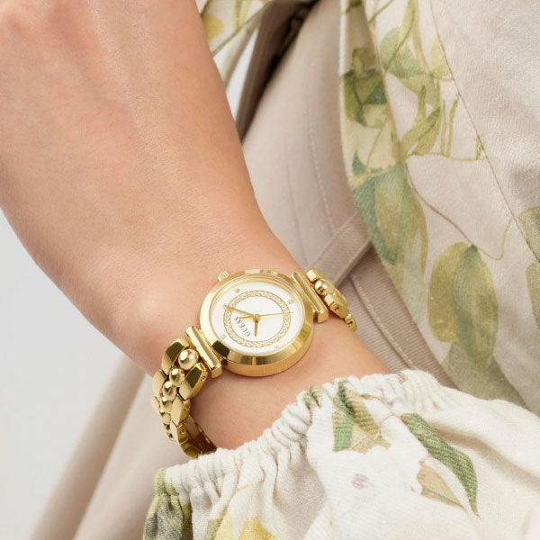 This compact 26mm silhouette spotlights a white sunray dial accented with crystal hour markers and a radiant crystal ring that beautifully catches the light. A polished gold-tone stainless steel case and matching bracelet strap, with self-adjustable G-links, deliver a rich, mirror-bright finish that is elevated, modern and photo-ready. Scaled down for a neat, tailored fit, the profile stays sleek and refined so the shine does the talking.