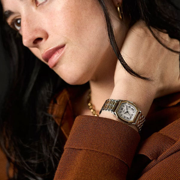 Inspired by a classic archival style, Harlow brings the sophistication of the past to modern day. This intricate polished multi-tone stainless steel five-link bracelet watch features an octagonal-shaped case, textured cream dial and three-hand movement.