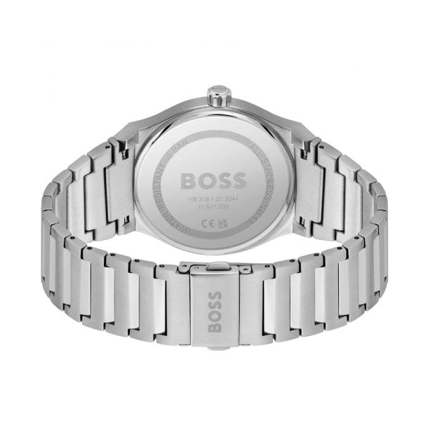 BOSS gents three hand with date window watch from the Candor family. Featuring a 41mm stainless steel case, blue dial and stainless steel bracelet. Water resistant to 5 ATM.