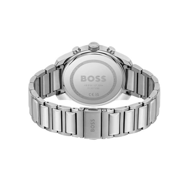This BOSS watch features a stainless steel strap, casing and a red coloured dial. It also has three chronographs and a date function.