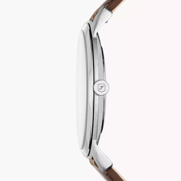 The Fossil Minimalist features a cream satin dial with stick indices, three-hand movement and a brown leather strap.