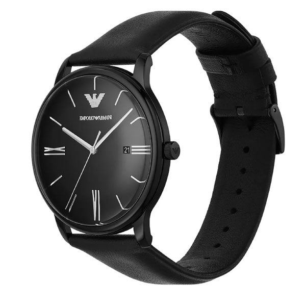 This Emporio Armani watch has a case diameter of 42mm and is made of stainless steel with a black finish. It is fitted with a black leather strap and features a black dial. Inside the case lies a miyota movement and the watch features a mineral crystal glass.
