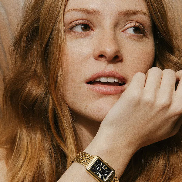 This gold-tone watch features a rectangular stainless steel case paired with a matching stainless steel bracelet for a cohesive design. The satin-finished black dial adds depth and contrast, complemented by a three-hand display and date function for added function.