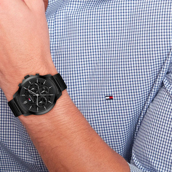 This Men's Tommy Hilfiger Henry Watch has an ionic plated black steel bracelet strap and case with a black coloured dial, featuring three sub dials. It features the iconic Tommy Hilfiger logo on the dial.