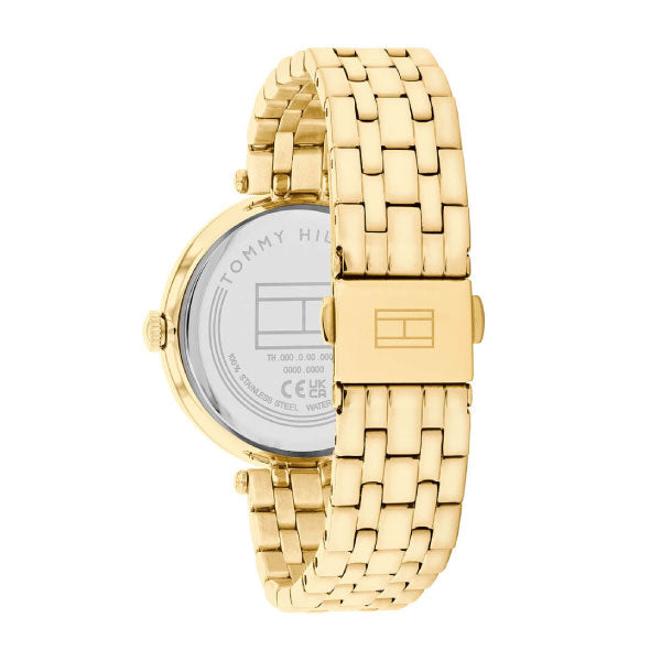 Introducing this stunning design from Tommy Hilfiger and part of the Natalie collection. Encrusted with a bezel of sparkling round brilliant cut cz stones this is a piece designed not to be missed. The simple champagne dial gives an everyday feel to this dressy piece, a large 34mm case completes the look with a gold coloured stainless steel bracelet strap.