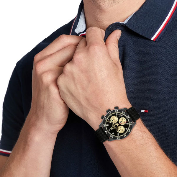 The Tommy Hilfiger TH85 watch features a bold, round case that houses a striking black dial. The dial is equipped with three subdials, adding depth and complexity to its design. Prominent hour markers and hands stand out against the dark backdrop, ensuring easy readability. The watch operates with a quartz movement, offering practical functions such as a date display, stopwatch, and a stopwatch with split time functionality. The timepiece is designed to withstand splashes with its 5 ATM water resistance, making it suitable for everyday use.