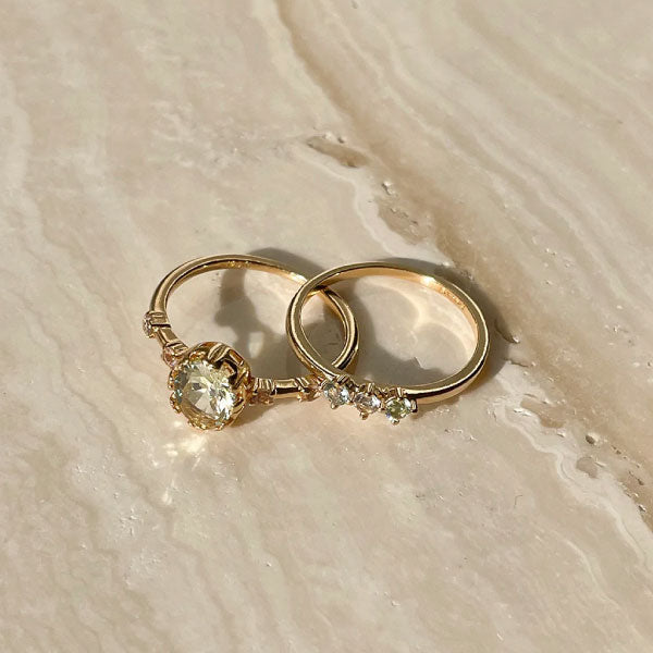 This beautiful 24Kae ring is set with beautiful pastel light green coloured stones. This ring is made of 925 sterling silver plated with 14 carat gold. Every 24Kae jewellery piece is designed with love and an eye for detail by Kae Sutherland. Each 24Kae ring has the authentic characteristic of a 24Kae engraving.