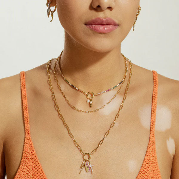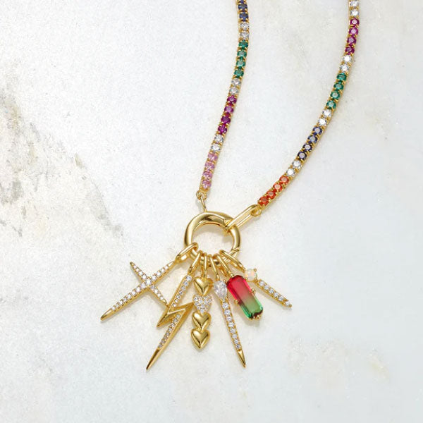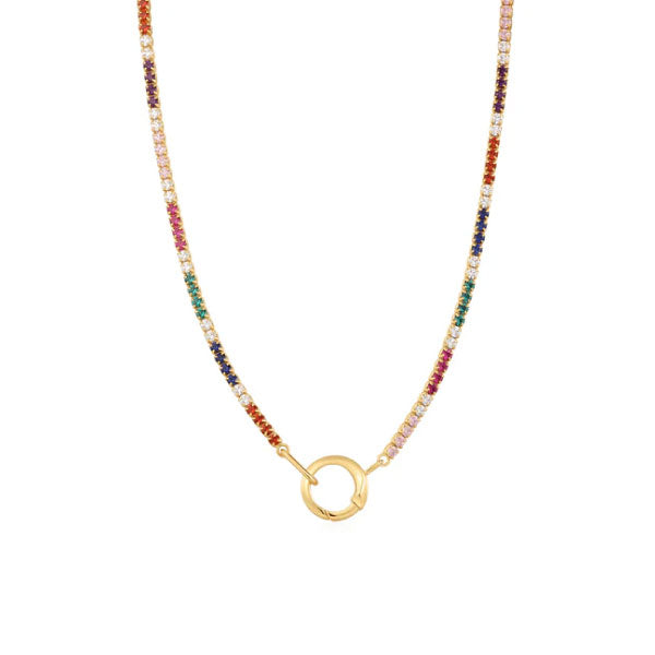 Make colour and sparkle your go-to look with this statement rainbow chain, complete with the chic gold connector detail, all crafted from 925 sterling silver with 14kt gold plating. A row of vibrant rainbow coloured cubic zirconia makes up the playful chain, finished with a simple gold connector. Simply open the connector and slip on your favourite charm from the Pop Charms collection to mix up your jewellery style for any occasion.