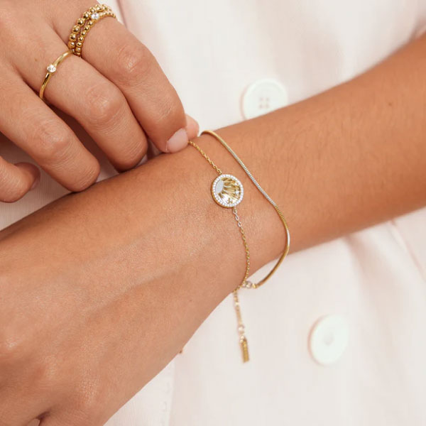 Revamp your jewellery wardrobe with our unique bracelet. Inspired by sunshine, this piece is embellished with mother of peal and cubic zirconia stones with exquisite craftsmanship, statement enough to be worn solo or stacked with other chains.