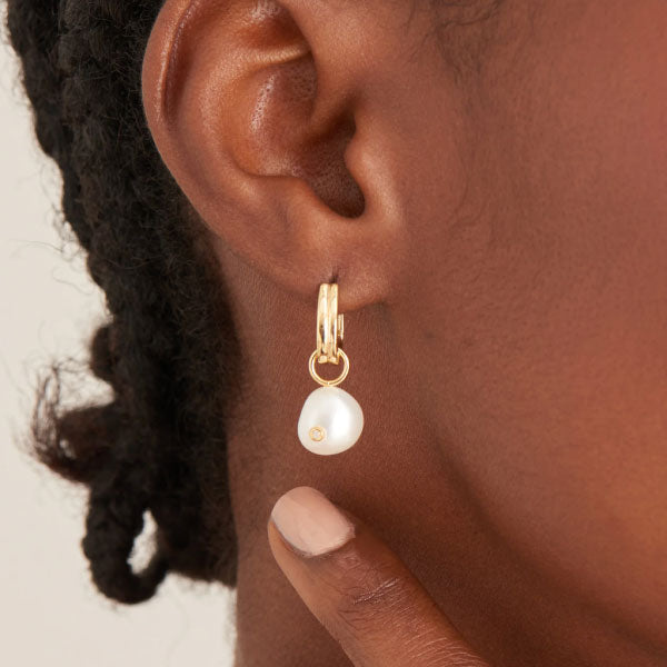 Up the ante with your ear stacks with a perfect pairing of pearlescent shimmer and sparkle with these elegant pearl drop huggie hoops. The chunky gold huggie hoop is linked to a suspended iridescent pearl droplet, finished with a single cubic zirconia stone for all the seasonal sparkle. Create a unique stack by styling with everyday huggies and studs.