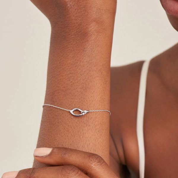 The perfect balance of simplicity with a touch of uniqueness, this effortless link bracelet is delicately timeless. Embodying the soft curves of the waves, it features a smooth silver link detail set on a subtle adjustable chain. Wear it solo or layer with more delicate chains for a chic and on-trend look.
