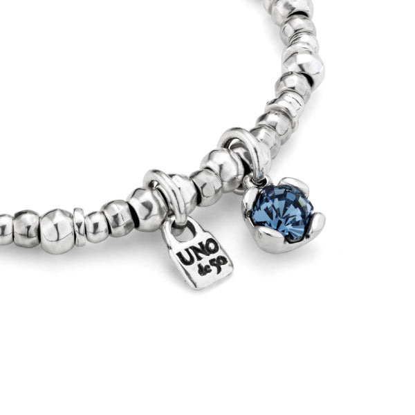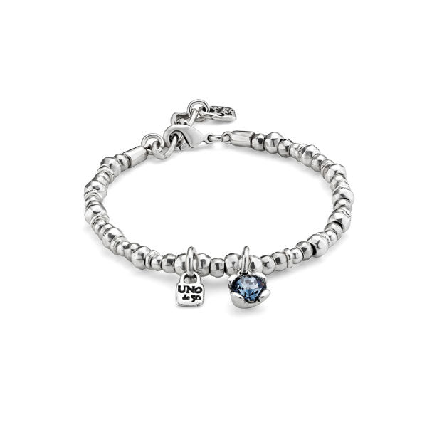 Sterling silver plated bracelet with a bead and two charms; a blue faceted crystal and the iconic UNOde50 padlock. It has a carabiner clasp and an adjustable chain that allows to fit the bracelet to the desired size. Jewel 100% handcrafted in Spain, achieving a unique design finish.