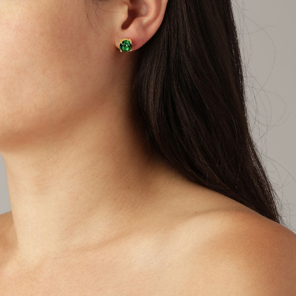Daze - a mid-sized stud earpost made in polished brass with a light and simple prong setting. Surgical steel post. A large facetted solitaire crystal adorns the front. Shown here with a classic emerald green crystal on a gold tone finish.