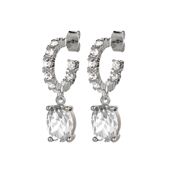 BARBARA is a luxurious hoop style earring lavishly handset with sparkling facetted crystals all over - and furthermore a larger oval oval crystal pendant. Stud clasp in surgical steel. Body made in polished brass. Here shown in silver tone with white crystals. DANISH DESIGN - free of cadmium, nickel and lead.