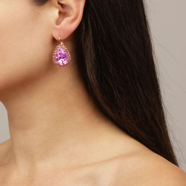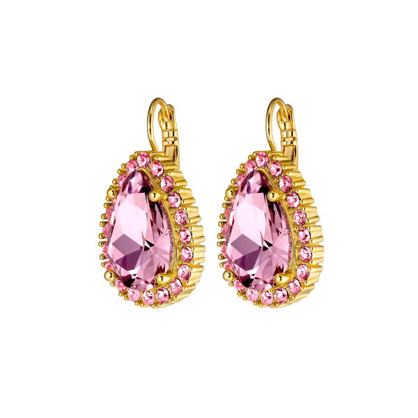 FIORA is a modern romantic french hook earring, featuring a large dropshaped crystal, beautifully flanked with contrasting smaller crystals. Created in polished brass, IP plated in gold tone. Hook made in surgical steel. Length approx. 28 mm. Here shown in a romantic rose on gold tone metal. DANISH DESIGN - free of cadmium, lead and nickel.