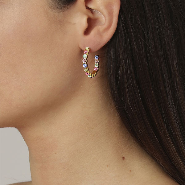 HOLLY - Large hoop earring lavishly set with multi coloured pastel facet cut crystals set on front and back. Made in polished brass, silver tone finish. Post is surgical steel.