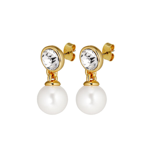 NETTE is a chic earring with stud clasp - crystal deco in a modern box setting and a white imitation pearl pendant. Here shown in gold tone, white crystal and white pearl. Appr. 22 mm long. Danish design by DYRBERG KERN. High quality, free of nickel.Sorry, currently out of stock